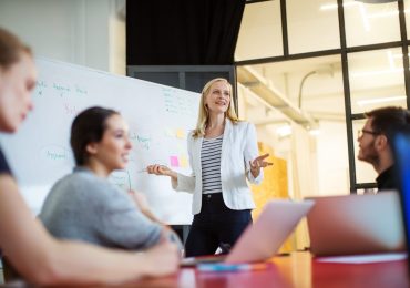Young businesswoman giving presentation on future plans to her colleagues at office