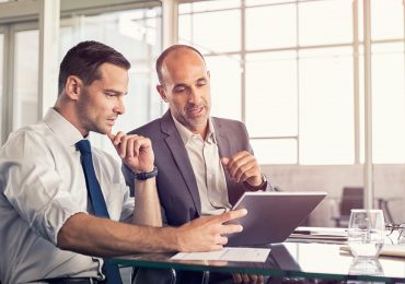 Businessman using a digital tablet to discuss information with senior leadership in a meeting. Business partners discussing plans. Mature boss and young business man working together in office.